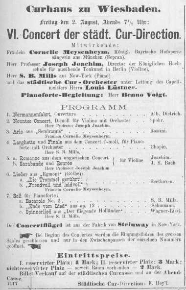 1867 und 1878 führten ihn Konzertreisen zurück nach Deutschland. Eine Ankündigung der Tour von 1878 erschien am 19. Juni in Frankfurter Zeitung und Handelsblatt, und am 2. Aug. trat Mills im Kurhaus Wiesbaden auf (s. Abb.); ob er in Frankfurt/M. auch gastierte, ist nicht bekannt. Im Januar 1881 zog er sich aus dem Konzertbetrieb zurück und widmete sich in New York dem Unterrichten. Im Sommer 1894 hielt er sich zur Kur in Neuenahr auf, und als ihn mehr und mehr gesundheitliche Probleme plagten, zog er auf Anraten seiner Frau Antonia, geb. Young, im April 1898 nach Wiesbaden, wo er in einer Privatpension bis zu seinem Tod lebte.