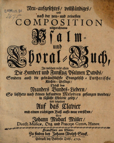 Werke — XII SONATES à un Hautbois de Concert, qu’on doit jouer sur cet Instrument sur tout quand il y a écrit Solo, deux Hautbois ou Violons, une Taille, un Fagot & Basse Continue pour le Clavecin, ou Basse de Violon […] Premier Ouvrage, Amsterdam: Roger [1709/10]; s. RISM M 7904 <> (mit 21 Melodien Müllers:) Neu-aufgesetztes / vollständiges / und nach der neu- und reinesten COMPOSITION eingerichtetes Psalm- und Choral-Buch, In welchem nicht allein Die Hundert und Funffzig Psalmen Davids / Sondern auch die gebräuchlichste Evangelisch-Lutherische Kirchen-Gesänge / Nebst des Neanders Bundes-Liedern / So bißhero nach keinen bekandten Melodien gesungen worden / in fügliche Melodie gesetzt / Und insgesamt Auf das Clavier mit einem richtigen Baß aufs neue versehen, Frankfurt/M.: Stock 1718 bzw. 1719 [vgl. hierzu Schaefer, S. 564 und 568]; s. RISM M 7898 (s. Abb. aus D-Mbs) – 2. erw. Aufl. Frankfurt: Stocks Erben 1735 bzw. 1736; s. RISM M/MM 7899 bzw. MM 7899a – weitere erw. Aufl. als Vollständiges Hessen-Hanauisches Choral-Buch, hrsg. von Johann Daniel Müller, ebd. 1754; s. RISM M 7900 <> Anhang Zu dem Müllerischen Psalmen- und Choral-Buch […], ebd. 1739; s. RISM M 7901 – Vermehrter Anhang […], ebd. 1741; s. RISM M 7902 <> Variirter Choral- und Psalmen, Mit einigen kurtzen Präludien, Bey dem Gottes-Dienst und Privat-Andacht nützlich zu gebrauchen […] Erster Theil, Frankfurt/M.: Stocks Erben 1735; s. RISM M 7903 – ein 2. Teil (mit „Präludia, Fugen und 1 Concert“) erschien Adlung (S. 694) zufolge ebd. 1739; er ist nicht überliefert.