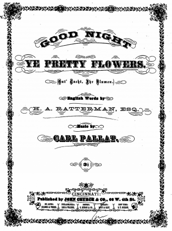 Werke — 2 Lieder (Der Mond, Gut’ Nacht, ihr Blumen; Sst., Kl.), Mainz: Schott [1868]; D-B (Druck sowie Ms. vom 25. Aug. 1864 (s. RISMonline)) – Nr. 2 als zweisprachige Fassung, Cincinnati: John Church & Co. [1871]; US-Wc (digital, s. Abb.)