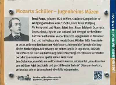 Abbildung 2: Die Gemeinde Jugenheim erinnert an ihren Ehrenbürger Ernst Pauer, wobei unsere Feststellung, dass die Formulierung „Mozarts Schüler“ ein wenig missverständlich ist, Pauers Engagement keinen Abbruch tun soll; Foto von Rüdiger Spielkamp, Okt. 2025