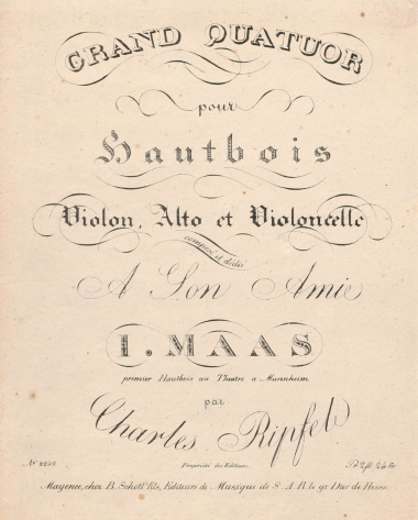 Werke — Grand Quatuor (Ob., Vl., Va., Vc.) (W. J. Maas, dem ersten Hautboisten des Mannheimer Orchesters, gew.), Mainz: Schott [1825]; D-B, D-Mbs (digital, s. Abb.; Stichvorlage dat. Febr. 1822 digital), I-Mc <> unveröffentlichte Werke: Andantino (Vc., Kl.) „für L. Ehrmann zum Andenken“ (1834); Ms. in GB-Cu <> Concertante (Vc., B.) (aufgef. Frankfurt/M. 1850 von Christian Siedentopf und Franz Seraphim Sachar) <> Canon (2 Vc.), Ms. in F-Pn <> Chant de Berceau und Andante (2 Vc.), Ms. in F-Pn <> Etude (Vc.); Ms. in F-Pn <> Etude. Caprice, d’après un thème de Boccherini (Vc.); Mss. in F-Pn und I-BGi <> Notturno (Vc., Kl.); Ms. in F-Pn <> Wasielewski erwähnt zudem mehrere Streichtrios