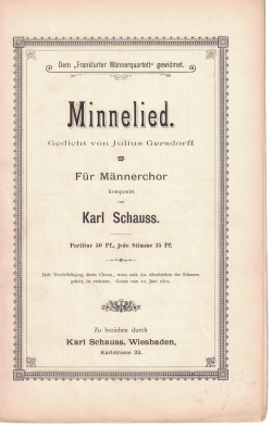Quellen — Standesamtsregister Wiesbaden <> Adressbücher Wiesbaden 1879ff. <> Die Lyra (Wien) 1. März 1891, 1. Nov. 1896, 1. Aug. 1904 und passim; Wiesbadener Bade-Blatt 19. Mai 1896, 27. Aug. 1907, 3. Dez. 1926, 7. Dez. 1926, 22. Sept. 1928 und passim; Wiesbadener Tagblatt 25. Mai 1901, 7. Jan. 1903, 25. Okt. 1903 (Beilage), 11. März 1906, 11. Febr. 1909, 11. Mai 1911, 1. Apr. 1912 und passim; Wiesbadener General-Anzeiger 24. Sept. 1902, 17. März 1903, 24. Jan. 1906, 17. März 1906, 7. Mai 1906 und passim; Wiesbadener Neueste Nachrichten 29. Sept. 1913, 30. Sept. 1913, 22. Okt. 1918, 31. Okt. 1919, 31. Juli 1920, 5. Febr. 1921, 30. Dez. 1921, 28. Aug. 1922 und passim; Wiesbadener Zeitung 13. Nov. 1914, 16. Jan. 1920, 2. Aug. 1920 und passim <> Druckbuch des Verlags Schott Nr. 19; D-Mbs <> MMB; Pazdírek <> Lewin 1901, S. 125 <> Jansa 1911 (s. Abb. 1); Frank/Altmann 1927