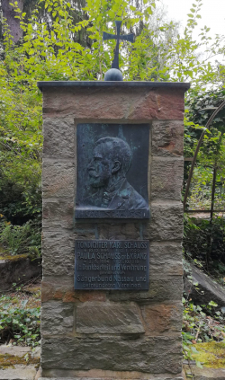 Abbildung 2: Grabstein Schauss’ auf dem Wiesbadener Nordfriedhof („In Dankbarkeit und Verehrung gewidmet vom Sängerbund Nassau und befreundeten Vereinen.“; Abt. 21), aufgenommen von Kristina Krämer im September 2021