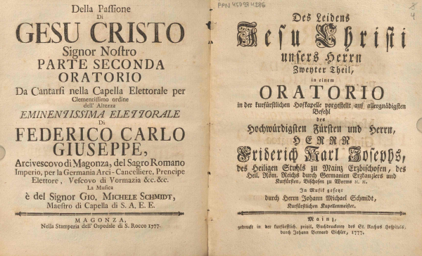 Werke — Drucke (ausschließlich Libretti): Tod und Begräbnis Jesu, zweiter Teil 1761; lt. Gottron in D-MZp (vermisst) <> Die Abnehmung vom Kreuz Jesu Christi 1766; lt. Gottron in D-MZp (vermisst) <> Gephte (Text: Mattia Verazi), 1. Teil, Mainz: Ockel 1767; D-MZp (digital) <> Gephte (Text: Mattia Verazi), 2. Teil, ebd. 1768; D-MZp (digital) <> Sant’ Elena al Calvario (Text: Pietro Metastasio), 1. Teil, ebd. 1769; D-MZp (digital) <> La Passione di Gesu Cristo Signor Nostro (Text: Pietro Metastasio), 1. Teil, Mainz: Sichler 1775; D-MZp (digital) <> Della Passione di Gesu Cristo Signor Nostro (Text: Pietro Metastasio), 2. Teil, ebd. 1777; D-MZp (digital, s. Abb.) <> Manuskripte: Missa in D (4 Sst.; D-Mbs <> In die clara iucunda (Offertorium de uno sancto vel sancta) (4 Sst.); D-Mbs, s. RISM ID 1001082772 <> Iustus ut palma florebit (Offertorium de Tempore) (4 Sst.); D-Mbs, s. RISM ID 1001082785 <> Laudetur Jesus Christus (Offertorium) (4 Sst.); D-Mbs <> Venite ad me omnes (Offertorium) (4 Sst.); D-Mbs, s. RISM ID 1001082773 <> Venite vos gentes fideles (Offertorium) (4 Sst.); D-Mbs <> Miserere (4 Sst.); D-Mbs, s. RISM ID 1001082748 <> Litaniae de Sancto Joanne Nepomucene (4 Sst.); D-Mbs, s. RISM ID 1001082721 <> Sanctorum meritis (Hymnus) (1 Sst.); D-Mbs, s. RISM ID 1001160120 <> Jesu Redemptor omnium (Hymnus) (1 Sst.); D-Mbs, s. RISM ID 1001082714 <> Konzerte und Sinfonien (teils zweifelhaft, teils vermutlich aus Schmidts Augsburger Zeit) in D-HR, D-MÜu, D-Rtt, CH-MÜ, A-SEI