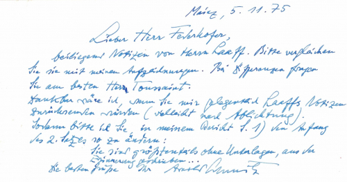 Abbildung 2: Mitteilung Arnold Schmitz’ an Hellmut Federhofer mit Erwähnung von Ernst Laaff und Georg Toussaint, Mainz 5. Nov. 1975; D-Kbeer