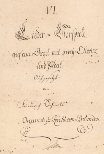 Werke — Sei Sonatine per il Cembalo obligato con Violino e Violoncello ad Libitum op. 1, Offenbach: André [1776]; s. RISM S/SS 1835 <> 3 Sonates (Kl., Vl., Vc.) op. 2, Speyer: Boßler [1788]; RISM ô (Auszug aus der 3. Sonate in: Anthologie für Kenner und Liebhaber der Tonkunst, 1. Band, Speyer 1789, S. 60) <> 3 Sonaten (Kl., Vl., Vc.) op. 3, ebd. (verschollen; lt. Gerber ATL) <> VI. Lieder=Vorspiele auf eine Orgel mit zweÿ Clavier und Pedal; Ms. in D-B, s. RISM ID 455031064 (s. Abb.) <> weitere Manuskripte s. RISMonline