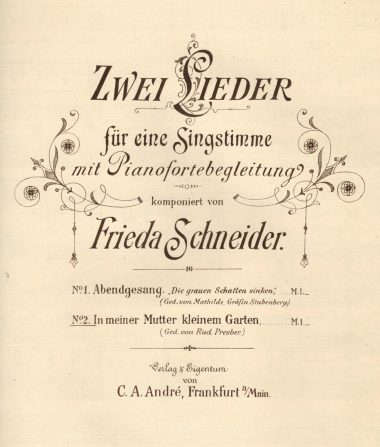 Werke — Zwei Lieder (Abendgesang, In meiner Mutter kleinem Garten (Sst., Kl.) (aufgef. im Konservatorium 5. Okt. 1905), Frankfurt: C. A. André [1907]; D-B, D-BABHkrämer (s. Abb.), D-OF (mit Herstellungsakte)
