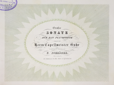 Werke — Sonate (Kl.) (Carl Guhr gew.), Offenbach: André (in Komm.) [1840]; D-OF (s. Abb.) <> Fantasie über ein Motif aus Mozart’s Figaro und Prume’s Melancolie (Kl.) op. 2, Wien: Haslinger [1842] <> 3 Morceaux de Salon (Kl.) op. 3, ebd. [1842] <> Fantasie über Motive aus der Oper Il Templario von Otto Nicolai (Kl.) op. 4, ebd. [1842]; D-B <> Fantasie über Motive aus Donizettis Lucrezia Borgia (Kl.) op. 5, ebd. [1843]; D-B <> Ungedruckt blieben eine „Etude eigener Composition“ (Allgemeine Wiener Musik-Zeitung 26. Okt. 1841) sowie „Capricen aus eigener Feder mit bizarrer Laune komponiert“ (AmZ 17. Mai 1848). Mit Vorbehalt sind Friedrich Schröder zuzuweisen: Quatre Mazurkas (Kl.) op. 8, Mainz: Schott [1849]; D-B. Mutmaßlich nicht von Friedrich Schröder stammen weitere, in Wien seit 1844 erschienene und in HmL nachgewiesene Werke eines Fr. [? = Franz?] Schröder.