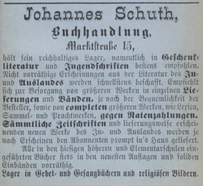 SCHUTH, JOHANN * Niederberg bei Koblenz 28. Jan. 1852 | † Koblenz 2. Jan. 1904; Buchhändler, Verleger, Musikverleger