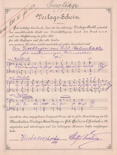 Abbildung: Verlagsschein Smolians für André in Offenbach, die Männerchöre op. 5 betreffend, Wiesbaden 9. März 1889; D-OF