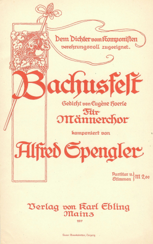 WerkeWanderschaft (Mch.), Mainz: Ebling [ca. 1912]; D-BABHkrämer, D-Hbierwisch, D-MZsch <> Verwehter Klang (Mch.) („Preischor für das höchste Ehrensingen um den Kaiserpreis. (Langen 1913)“), ebd. [1913]; D-BABHkrämer, D-Hbierwisch, D-MZsch <> Bachusfest (Mch.) („Dem Dichter [Eugène Hoerle] vom Komponisten verehrungsvoll zugeeignet“), ebd. [ca. 1914/15]; D-BABHkrämer (s. Abb.), D-Hbierwisch, D-MZsch <> Untreue („Mein Schatz geht zum Walde“; Mch.) op. 17, Heidelberg: Hochstein [1914]; D-B <> Mein Mütterlein („Nach meinem Heimatsorte zieht es mich“; Mch.) op. 21, ebd. [1914]; D-B <> Maien-Botschaft (Mch.) op. 30, Mainz: Ebling [ca. 1913]; D-BABHkrämer, D-Hbierwisch, D-MZsch