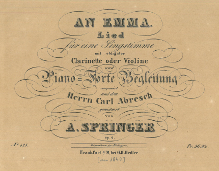 Werke — gedruckt: Der Wanderer (Sst., Kl.; Sst., Kl., Hr./Vc.) op. 2, Frankfurt: Dunst [1841] <> An Emma (Sst. m. Klar./Vl., Kl.) op. 4, Frankfurt: Hedler [1845]; D-F (s. Abb.) <> Die belohnte Milde (Sst. m. Kl.), ebd. [1845]; D-F, GB-Lbl (digital) <> Fest-Marsch z. Erinnerung a. d. Einzugs-Tag d. Kronpr. Carl v. Würtenberg u. s. Gemahlin Grossfürstin Olga in die Stadt Heilbronn (Kl.), Stuttgart: Wagner [1847]; D-Sl <> Heimweh (Sst. m. Klar., Kl.), Mainz: Schott [1851]; D-B <> Souvenir. Pensée romantique (Kl.), Stuttgart: Ebner [1862] <> Die Sehnsucht (Kl.) op. 10, Offenbach: André [1866]; D-OF, GB-Lbl <> Die Reiselust. Fantasie (Kl.) op. 11, ebd. [1871]; D-OF <> Mairöschen (Sst., Kl.) op. 12, ebd. [1875]; D-OF <> Vater unser, ebd. [1875]; D-OF <> ungedruckt (und wohl verschollen): Fantasie (Klar.; vgl. Didaskalia 22. Jan. 1841) <> Die Heimath (Sst. m. Bassethr.; vgl. FOPAZ 27. Jan. 1841) <> Des Hirten Winterlied (Sst. m. Klar.; vgl. Didaskalia 5. Febr. 1841) <> Variationen (Bassethr.; vgl. Didaskalia 6. Aug. 1841) <> Potpourri über beliebte Schweizer Themas (vgl. Didaskalia 4. März 1842) <> Die Bergknappen (Drama mit Gesang, Text von Ferdinand Joost; vgl. Didaskalia 28. Jan. 1847)