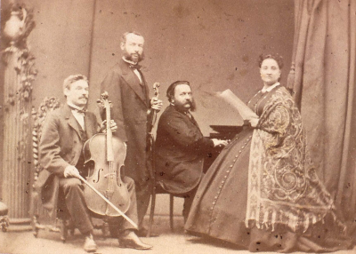 Abbildung 1: Gruppenfoto Julius Steffens mit Vieuxtemps, Jaell und der Patti, Foto von Amand Helm, veröff. Prag: Schalek u. Wetzler, 1864; F-Sn (digital)