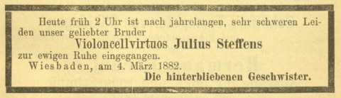 STEFFENS (auch Stefens), CARL JULIUS (auch Jules) * Stargard, Pommern (heute Polen) 12. Juli 1831 | † Wiesbaden 4. März 1882; Cellist und Komponist