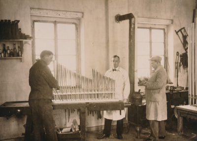 Abbildung 1: Johann Stockhausen jun. (Mitte) 1929 mit zwei Mitarbeitern in seiner Werkstatt – augenscheinlich ist man beschäftigst mit der Orgel für die evangelische Kirche in Linz; Stadtarchiv Linz am Rhein – Frau Andrea Rönz herzlichen Dank für ihre Unterstützung und die Veröffentlichungserlaubnis.