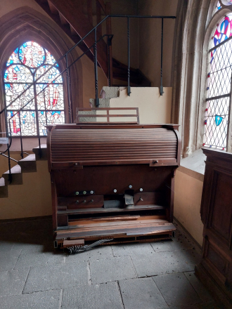 Abbildung 2: Spieltisch der bis in die 1960er Jahre genutzten Stockhausen-Orgel auf der Empore der Martinskirche in Linz am Rhein; aufgenommen von Gudula Schütz im Juni 2025 – Herrn Peter Gillrath (Linz) herzlichen Dank!