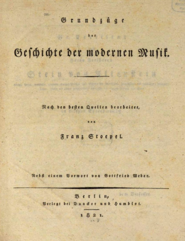 Werke — Kompositionen: Variationen für’s Pianoforte op. 10, Hildburghausen: Kesselring [1824] <> Geistliche Gesänge (4 Sst. bzw. Sst., Kl.) op. 11, Frankfurt/M.: Andreä [1824] – später Frankfurt: Fischer; D-F <> Lied Gretchen vor dem Bilde der Mater Dolorosa (Sst., Kl.), Erfurt: Suppus [1824]; D-WRz <> Melodora. Töne der Liebe, Sehnsucht und Hoffnung (Sst., Kl.), 1. Heft, Leipzig: Hofmeister in Komm. [1817]; s. hierzu AmZ 28. Jan. 1818 sowie Intelligenzblatt 6, 1. Juli 1818 <> Melodora, deutsche Gesänge (Sst., Kl.), 2. Heft, Berlin: Christiani [1820]; D-Dl <> Melodora, deutsche Gesänge (Sst., Kl.), 3. Heft, Frankfurt: Fischer [1826] <> Schriften: Grundzüge der Geschichte der modernen Musik. Nach den besten Quellen bearbeitet […] Nebst einem Vorwort von Gottfried Weber, Berlin: Duncker & Humblot 1821; D-Mbs (digital, s. Abb.) <> Neues System der Harmonie-Lehre und des Unterrichts im Pianoforte-Spiel, 3 Teile, Frankfurt: Andreä 1825 und 1827; A-Wn (digital), D-Mbs (digital: Teil 1, 2, 3) <> Freimüthige Worte. Ein Beitrag zur Beurtheilung der Schrift: System der Musik-Wissenschaft und der praktischen Composition, München: Sidler 1827 (digital) <> Ueber die Logiersche Musiklehrweise, in: Allgemeine Schulzeitung 14. Juli 1825, S. 641–645 <> Andeutungen im Gebiete der Harmonielehre, in: AmZ 3. Aug. 1825, Sp. 517–526, und 16. Nov. 1825, Sp. 757–760 <> Textbeiträge zur Gazette musicale de Paris (1834–1836) <> Herausgabe: Allgemeine Zeitung für Musik und Musikliteratur, Berlin: Christiani 1820 (Nr. 1–3) <> Übersetzung: Theorie des Contrapunktes und der Fuge von L. Cherubini […] Aus dem Französischen übersetzt […], Leipzig: Kistner/Paris: Schlesinger [1835/36] (digital)