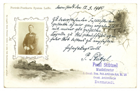 Bei strenger Auslegung unserer Richtlinien hätte Paul Stützel keine Chance auf ein Denkmal in Form eines MMM-Artikels; er würde das Schicksal zahlloser anderer Musikerinnen und Musiker teilen, die „Werke“ in einem engeren Sinne nicht hinterlassen haben und deshalb durch den Rost fallen. Es sei jetzt nicht aufs Neue diskutiert, warum jene Entscheidung gefällt wurde; wichtig ist, dass es selbstverständlich Ausnahmen gibt sowie auch Begründungen hierfür: Die abgebildete Postkarte von der Hand und mit dem Portrait Paul Stützels – gefunden von Frau Margit Rinker-Olbrisch bei Erschließungsarbeiten im Wormser Stadtarchiv – rechtfertigt eine Abweichung von der Norm, denn sie ist eine überaus wichtige Quelle. Hintergrund waren die enorm aufwendigen und bis in alle Einzelheiten durchgeplanten Feierlichkeiten anlässlich der Einweihung der neuen Straßenbrücke über den Rhein in Worms am 26. März 1900, an denen nicht nur der Landesherr Großherzog Ernst Ludwig von Hessen-Darmstadt – er gab dem Bauwerk (an der Stelle der heutigen Nibelungenbrücke) seinen Namen – teilnahm, sondern die gesamte Bevölkerung in vielfältiger Weise mit von der Partie war. Natürlich gehörten auch musikalische Veranstaltungen zum Festprogramm, und Paul Stützel, zunächst Stabstrompeter, seit 1890 Musikdirektor des Großherzoglich Hessischen Feld-Artillerie-Regiments Nr. 25, brachte sich und seine Leute gleichsam in Stellung: „Zu bevorstehenden Festlichkeiten gestatte ich mir ganz ergebenst mit meiner gut geschulten Kapelle zu Musikaufführungen jeder Art bestens zu empfehlen“. Vielleicht war Stützel etwas zu spät dran mit seinem Angebot an die Wormser Bürgermeisterei; zumindest im offiziellen Festprogramm findet sich keine Spur von ihm und seiner Kapelle – das Darmstädter Hoforchester unter Friedrich Rehbock war zumindest für die zentrale Festveranstaltung engagiert worden, in der auch der Wormser Sängerbund, begleitet von der Kapelle des Großherzoglich Hessischen Landwehr-Regiments Nr. 118, auftrat. Was wir aber lernen: Vor allem jenseits der Wintermonate, während derer die Mitglieder der Militärkapellen vielfach Verpflichtungen innerhalb der Hoforchester und -theater hatten, sowie auch jenseits militärischer Aufgaben waren insbesondere die Kapellmeister ständig auf der Suche nach Auftrittsmöglichkeiten, um den Unterhalt ihrer Musiker zu gewährleisten. Neben herausgehobenen Anlässen, die gute Einnahmen versprachen, und dem Privileg, im städtischen Musikbetrieb Abonnementskonzerte veranstalten zu dürfen, boten vor allem Jahrmärkte, Volks- und Gesangsfeste während der schönen Jahreszeit Gelegenheit, das Publikum zu unterhalten; vgl. etwa die Abbildungen in unseren Artikeln zu Theodor Adam und Eberhard Schaefer. Dass Stützel 1887 vom Landesherrn mit dem Silbernen Kreuz des Verdienstordens Philipps des Großmüthigen ausgezeichnet wurde, wollen wir nicht unerwähnt lassen – die Postkarte zeigt ihn mit einer ganzen Reihe weiterer Ordenszeichen, die er mit erkennbarem Stolz trug.