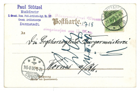 Abbildung: Postkarte Paul Stützels mit Portrait, Stempel und eigenhändigem Anschreiben an Wormser Bürgermeisterei (1900); D-WOsta
