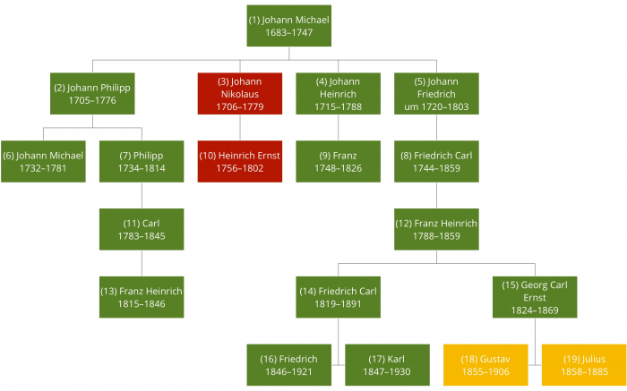 Dargestellt sind die Sulzbacher Linie in grün, die Kastellauner Linie in rot und die Kirner Linie in gelb (vgl. Scheiwen, Die Orgelbauerdynastie Stumm in ihren Generationen, S. 27)