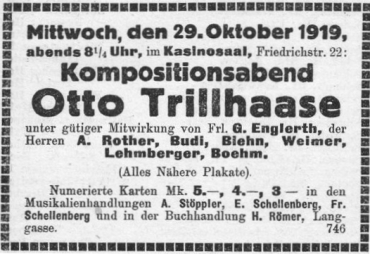 TRILLHAASE, (FRIEDRICH ADOLF) OTTO * Leipzig 10. Aug. 1886 | † Wiesbaden 7. Aug. 1975; Violinist, Bratschist, Pianist, Komponist