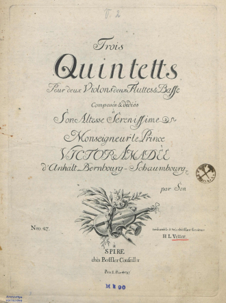 Werke — Cantate (Weint, Homburgs Bürger, jetzt) auf den Tod des Prinzen Victor Amadeus, o. O. [1790/91]; s. RISM V 1328 <> 2 Sinfonien (Nr. 3 und 4 in Sinfonien von verschiedenen Meistern), Offenbach: André [1775]; s. RISM V 1330 und 1331 <> Sinfonie (Nr. 1 in: XII Simphonies […] oeuvre II, 2. Livr.), Darmstadt: s. n., s. RISM V 1329 <> Trois Quintetts (2 Fl., 2 Vl., B.) op. 1, Speyer: Bossler [1784]; s. RISM V 1332 (Abb. aus D-Tu) <> handschriftlich überlieferte Sinfonien und Quintette stellen zum Teil Abschriften der gedruckten Ausgaben dar; vgl. RISMonline <> 1807 André angebotene „Duetten“ wurden nicht veröffentlicht.