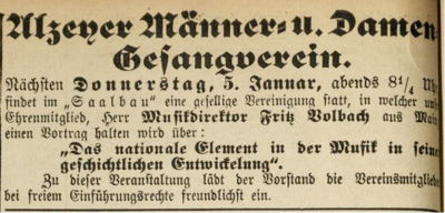 Während der Mainzer Jahre 1891 bis 1907 entstanden u. a. die Orchesterwerke Ostern op. 16, Es waren zwei Königskinder op. 21, die Ballade Vom Pagen und der Königstochter op. 18, die Gutenberg-Kantate op. 22, das Chorwerk Raffael op. 26, die Sinfonie op. 33, zudem (abgesehen von Texten für die Fachpresse) erste größere literarische Arbeiten. Dass Volbach überdies Begegnungen und freundschaftlichem Miteinander großen Wert beimaß, dokumentieren seine autobiographischen Aufzeichnungen: Was er über Wendelin →Weißheimer, Anton Urspruch, Engelbert →Humperdinck, Bernhard →Scholz, Gustav Kogel, Franz Mannstaedt, Hans →Pfitzner, Karl →Schumacher und nicht zuletzt Johannes →Brahms zu erzählen weiß, ist lesenswert – ebenso übrigens wie der köstliche Bericht über den Mainzer Karneval: Dass Redner, die zu langweilen begannen, durch einen Knopfdruck des Vorsitzenden samt Pult langsam in die Tiefe versenkt werden konnten (ebd., S. 86), darf als eine gesellschaftliche Errungenschaft ersten Ranges gesehen werden, die unbedingt wiederzubeleben ist – auch und vor allem außerhalb des närrischen Treibens, sofern der Knopf in den richtigen Händen ist und bleibt. Natürlich war Volbach, dessen Vortrag zum Thema Peter Cornelius als Dichter und Komponist am 15. Jan. 1905 in den Räumen der Liedertafel ausdrücklich erwähnt sei, auch in der näheren Umgebung unterwegs: Dafür, dass er 1898 kurzfristig für den erkrankten Dirigenten eingesprungen war, ernannte ihn der Alzeyer Männer- und Damengesangverein zum Ehrenmitglied (Alzeyer Zeitung 2. Juli 1898); für Volbach war dies keineswegs nur Zeichen und Ausdruck provinzieller Vereinsmeierei, denn schon wenig später konnte der Vorstand ihn für einen musikhistorischen Vortrag gewinnen (s. ebd. 5. Jan. 1899 sowie Abb. 6), und noch 1906 führte der Komponist in Alzey seinen Raffael auf. Wenigstens in den Jahren 1902 und 1904 war er auch als Gastdirigent des Wiesbadener Cäcilien-Vereins zu erleben. Im Rahmen seiner Vortragstätigkeit stattete Volbach beispielsweise 1907 auch dem Schmitt’schen Konservatorium in Darmstadt einen Besuch ab.