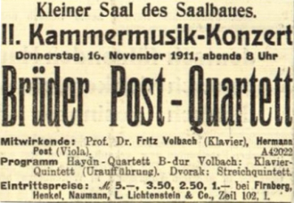 Abbildung 7: Anzeige der Uraufführung des Klavierquintetts op. 36 in Frankfurt mit Volbach und dem Brüder Post-Quartett (Frankfurter Zeitung und Handelsblatt 15. Nov. 1911 (3. Morgenbl., S. 6))