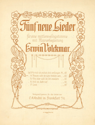 Werke (nur die musikalischen) — Zwei Lieder (Sst., Kl.; Ständchen, Entschwundenes Glück), Langensalza: Beyer [1873] <> Drei deutsche Lieder (Sst., Kl.) op. 5–7 (Friedrich Rotbart, Rolands Tod, Blücher am Rhein), Frankfurt: Steyl & Thomas [1899/1900]; D-B <> Fünf neue Lieder (Sst., Kl.) op. 12a, 14–17 (So halt ich dich umfangen, Warum sollt ich nicht fröhlich sein?, Wie aber sollt ich Dir erwidern, Still ist, doch tief, Lenz), Frankfurt: C. A. André [1906/07]; D-Hbierwisch (op. 14 unter Sammeltitel) <> Schill. Gedicht von Emanuel Geibel (Sst., Kl.) op. 18, Leipzig/München: Germann [1913]; D-B <> Landknechtslied (Mch.) op. 20, Offenbach: André [1918]; D-B <> Verzeichnis der in Wilhelm Volckmars musikalischem Nachlass befindlichen und gedruckten Kompositionen, Büdingen 1929
