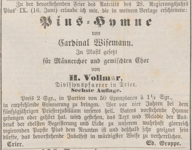 Abbildung: Anzeige der 1873 erschienenen 6. Aufl. der Pius-Hymne Heinrich Vollmars, in: Mosel-Zeitung 5. Juni 1873