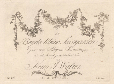 Werke (s. das Verzeichnis in MGG; Auswahl) — Cantata sacra (für die Kaiserkrönung Leopolds II. in Frankfurt 1790), Ms. s. RISMonline <> Oper Der Spiegelritter (Frankfurt 1791); Ms. s. RISMonline <> Klavierauszüge für Schott in Mainz zu Opern Dalayracs (RISM D 97, D 168 (D-Mbs, s. Abb.)) und Dittersdorfs (RISM D 3202, D 3214 u. a.)