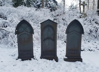 Abbildung 1: Grabsteine von Franz Gerhard Wegeler, seiner Ehefrau Eleonore und Tochter Helena verh. Bauer auf dem Koblenzer Hauptfriedhof; Foto: Martin Bierwisch (Jan. 2024)