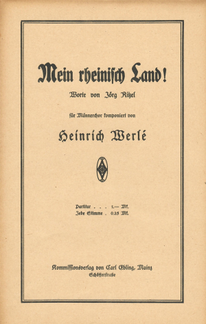 Abbildung 2: Titelseite des Männerchors Mein rheinisch Land!, dessen Text aus der Feder Jörg Ritzels, dem Vater von Waltrud Ritzel, stammt; D-BABHkrämer
