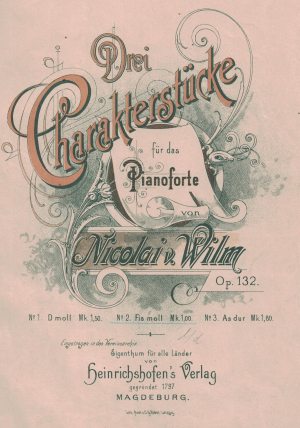 Nikolai von Wilm enstammte einem ebenso musikliebenden wie vermögenden Elternhaus; der Fürsprache seines Lehrers Conradin Kreutzer verdankte er die hingegen nicht selbstverständliche Erlaubnis, eine musikalische Laufbahn einschlagen zu dürfen, und studierte in den Jahren 1851 bis 1856 am Leipziger Konservatorium u. a. bei Ferdinand David, Moritz Hauptmann und Julius Rietz. Nachdem er anschließend eine Reise durch Deutschland, Belgien und Frankreich unternommen hatte, versah er 1857 kurzzeitig die Funktion des 2. Kapellmeisters am Rigaer Stadttheater, wandte sich aber bereits 1858 nach St. Petersburg, wo er seit 1860 als Lehrer für Klavier und Musiktheorie am kaiserlichen Nikolaj-Institut wirkte. Nicht lange nach seiner Eheschließung mit der Petersburger Staatsratstochter Johanna Karoline („Jenny“) geb. Lessig (1873) ließ er sich – gerade einmal 41 Jahre alt – 1875 in den Ruhestand versetzen und nahm seinen Wohnsitz zunächst in Dresden, bevor er sich 1878 dauerhaft in Wiesbaden niederließ. In jenem „Pensionopolis“ lebte er „ruhig und bescheiden in seinem Haus in der Pagenstecherstraße, dem seine liebenswürdige Gattin den Stempel der Gemüthlichkeit und des Wohlbehagens aufdrückt[e]“ (C. H., Nikolai von Wilm). Abgesehen von seinem anfänglichen Engagement im Vorstand des Wiesbadener Künstlervereins und auch abgesehen von der Tatsache, dass er als „häufiger Synagogenbesucher“ (Wiesbadener Synagogen-Gesänge, S. 4) in engem Kontakt mit der jüdischen Gemeinde stand, für deren Gottesdienste er musikalische Beiträge lieferte, hatte Nikolai von Wilm „mit der Öffentlichkeit […] nichts zu thun. Das trait d’union zwischen dem Componisten und der Welt [waren] seine Werke“ (ebd.). In der Tat widmete von Wilm – vergleichbar mit Alexander von Glaesz – sich während seiner Wiesbadener Zeit fast ausschließlich seiner schöpferischen Arbeit; die meisten seiner Werke (ab op. 20) erschienen ab den späten 1870er Jahren, wobei aus bisher unbekannten Gründen eine Zusammenarbeit mit in der Region ansässigen Verlegern nur selten zustandekam. Nikolai von Wilms Urne wurde auf dem Wiesbadener Nordfriedhof beigesetzt; seine Witwe starb 1921.