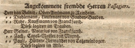 Abbildung 1: Zachs Aufenthalte in Darmstadt während der Jahre 1754 und 1755 sind durch die Fremdenanzeigen in der Presse dokumentiert; hier: Darmstädtisches Frag- und Anzeigungs-Blättgen 6. Febr. 1755