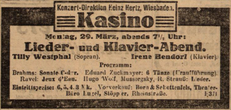 Abbildung 2: Ankündigung zur Uraufführung der 6 Tänze in Wiesbaden (Wiesbadener Tagblatt 21. März 1920)